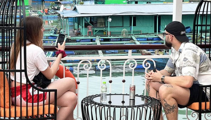 8:45 The trip starts! Our captain steers the cruise slowly, and the poetic scenery of Cai Beo ancient fishing village constantly appears with floating houses lying along the mountainside.
