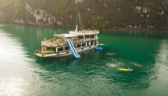 Lan Ha Bay day Cruise tour from Hanoi, Hai Phong, Cat Ba Island with unique itinerary on Serenity Premium Cruise with lots of outdoor activities like kayaking, swimming, snorkeling, jumping, etc.