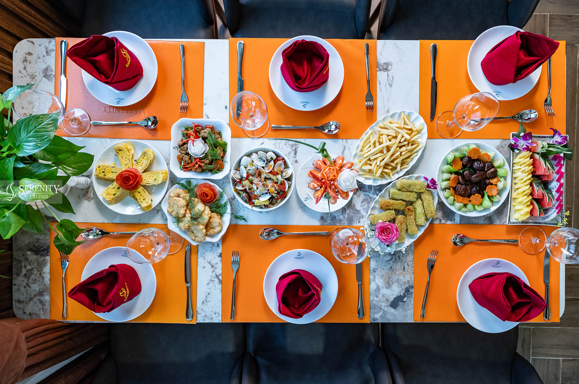 12:00 Quý khách trở về khu vực nhà hàng tại sảnh 1 và sảnh 2 của du thuyền thưởng thức bữa trưa (Đặc biệt nếu tổng đoàn khách trên tàu từ 40 người trở lên, bữa trưa sẽ phục vụ ăn Buffet) đậm hương vị biển Cát Bà giữa lòng di sản.